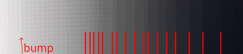 Here I mark the edge of the bands with red lines. Obviously they are not evenly-spaced (the left half is fine).